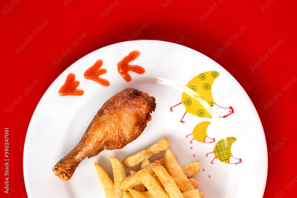 chicken thigh with french fries on a plate decorated with tomato sauce on a red table