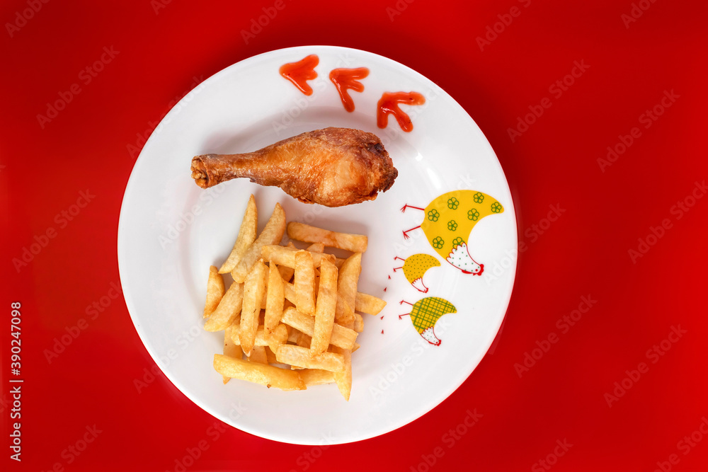 chicken thigh with french fries on a plate decorated with tomato sauce on a red table