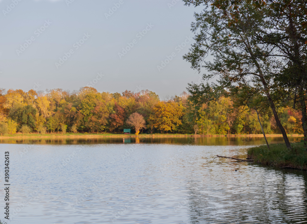 yellow green and red trees near the lake, autumn sideage, Yellow leaves, autumn, forest