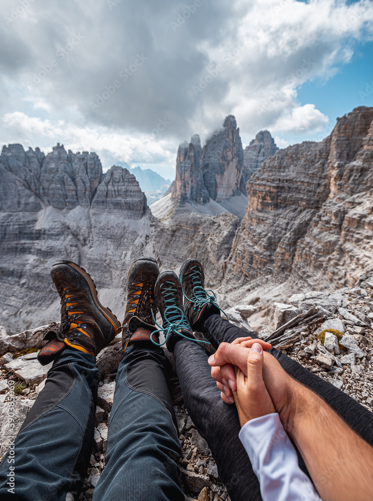 sitting on the edge at unesco world heritage region Dolomites Italy Tre Cime di Lavaredo