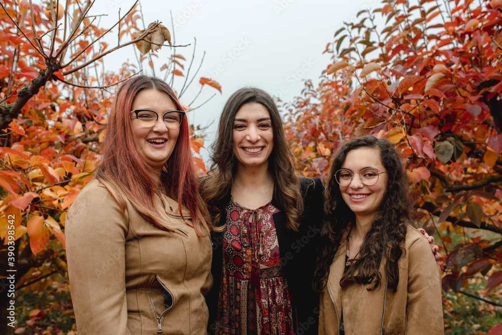 Three girls smiling portrait looking at the camera in a field during fall season. Togetherness, Autumn season, friendship, red and orange color concept.