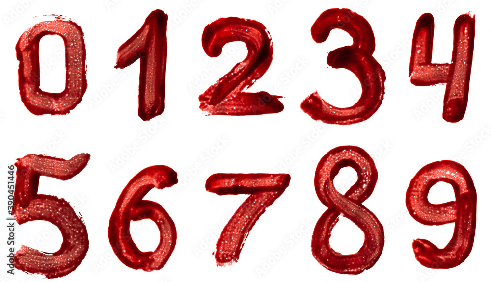 Set of numbers is drawn in red paint bloody isolated on a white background.