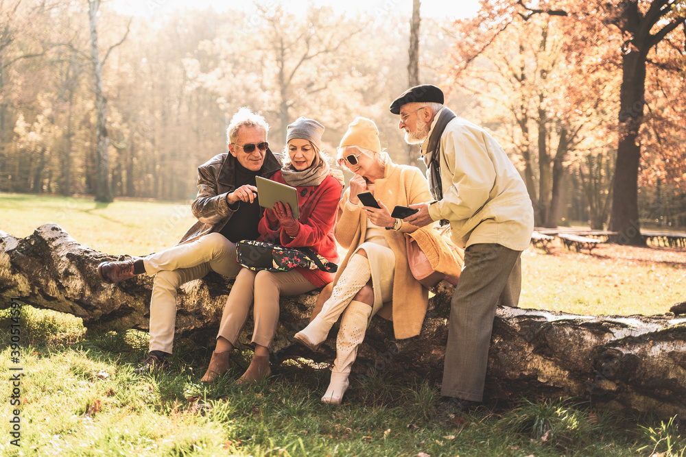Senior people using mobile phones and tablet in autumn park.