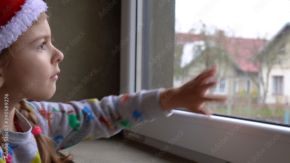 Little girl by the window in Santa hat. Orphans and Christmas . Orphanage life and holidays.