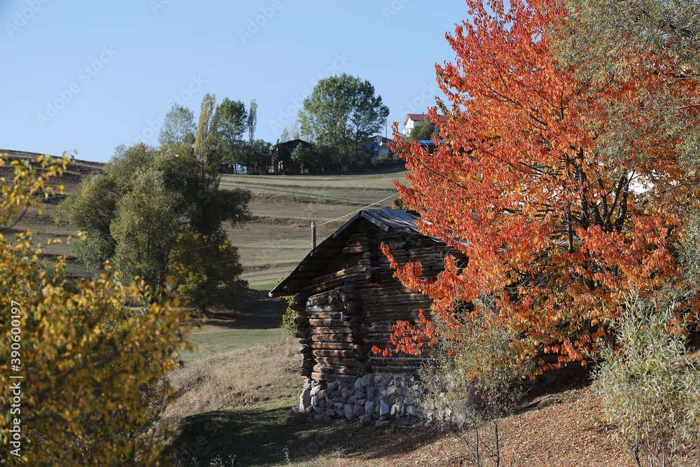 green fir trees in yellow and red colored autumn mountain forest.artvin