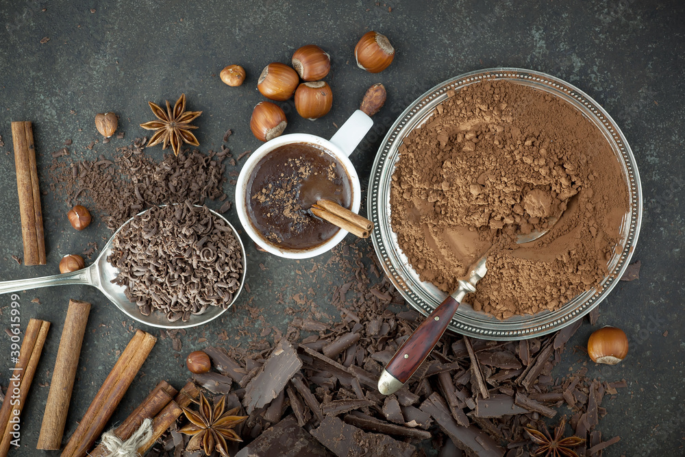 Pieces of dark chocolate and cocoa beans in composition on old background