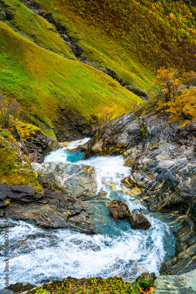 Wild and twisting waterfall flowing down a mountain slope in lush yellow and green autumn colors.