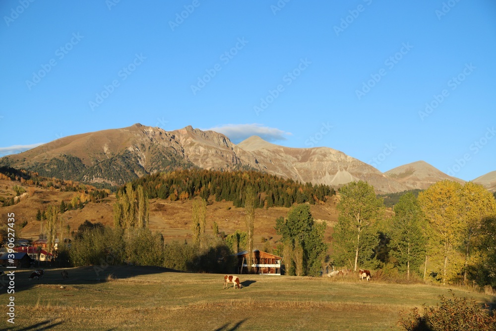 autumn panoramic landscape in mountains. fir trees around the pond on the meadow in yellowish weathered grass.ART