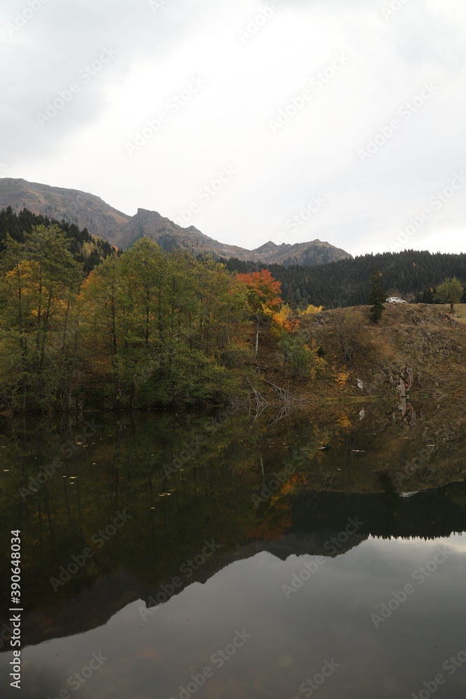 Autumn forest lake water view. Forest lake water in autumn. Autumn forest lake. Autumn forest lake view.artvin /TURKEY