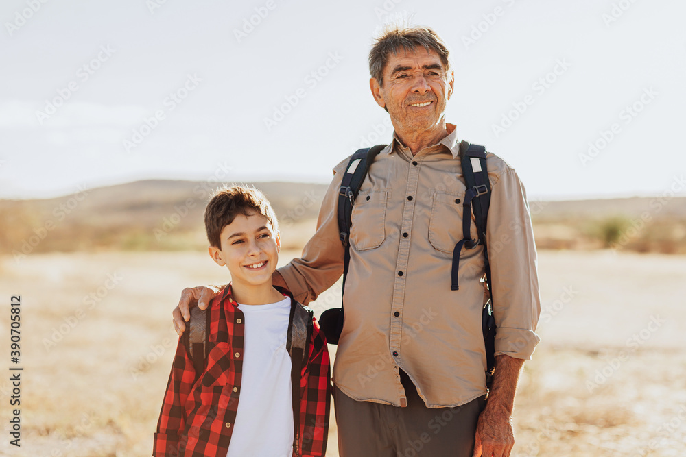 Latin grandfather and grandson with backpacks hiking in the mountains.