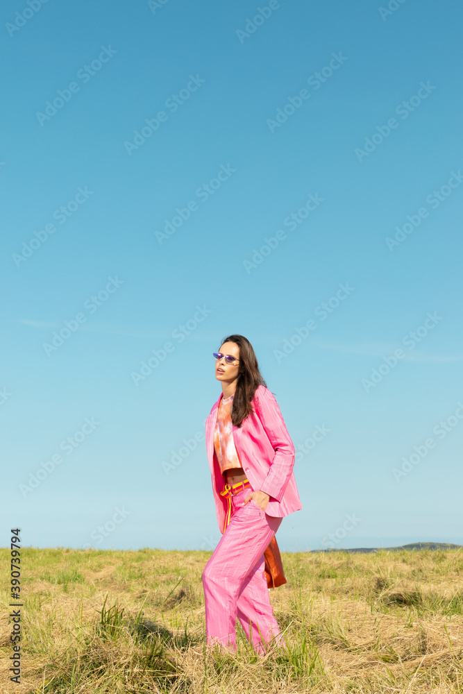 Young model woman wearing fashionable pink pants and glasses posing by the grass and blue sky playing with her long hair. Cute modern European model girl enjoys a walk on the beach. Spring summer