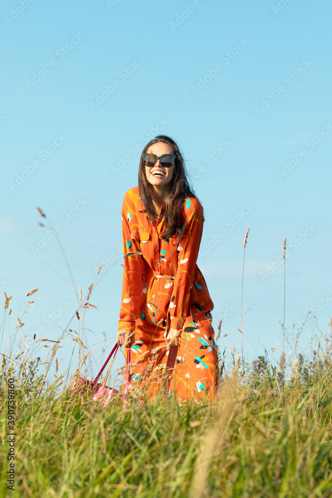Young woman with long hair and flowery fashion orange dress posing by tall grass and blue sky. Cute modern European model girl enjoys a walk on the beach. Spring summer fashion