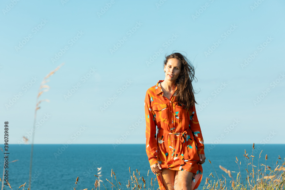 Young woman with long hair and flowery fashion orange dress posing by tall grass and blue sky. Cute modern European model girl enjoys a walk on the beach. Spring summer fashion