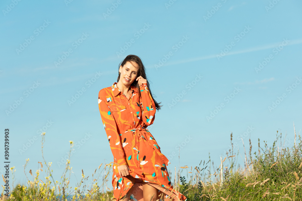 Young woman with long hair and flowery fashion orange dress posing by tall grass and blue sky. Cute modern European model girl enjoys a walk on the beach. Spring summer fashion