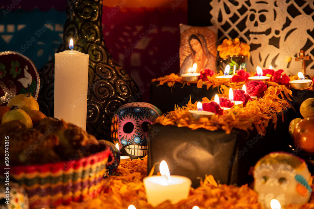 Colorful skull on colorful traditional Day of the Dead "ofrenda"