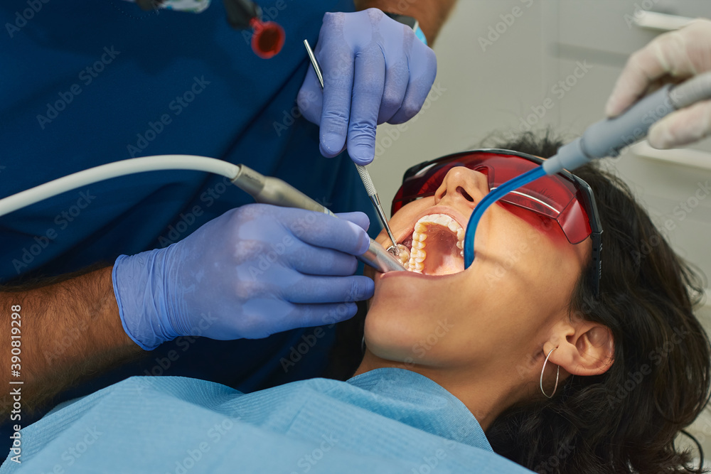 A woman lying in a dental office chair cleans her teeth.