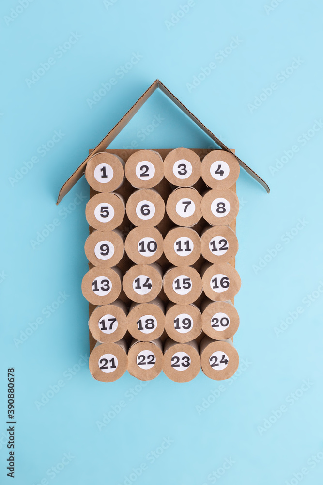 handmade advent calendar craft, DIY, step 4, top view, blue background