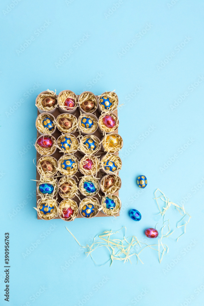 Toilet roll advent calendar craft, DIY, step 3, filling with sweets, top view, blue background, activity for kids tutorial