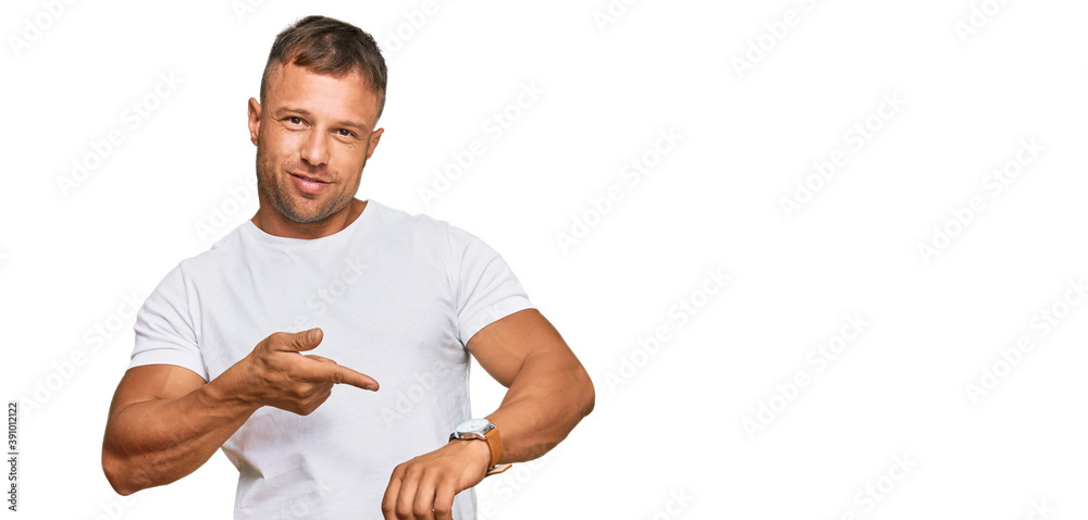 Handsome muscle man wearing casual white tshirt in hurry pointing to watch time, impatience, upset and angry for deadline delay