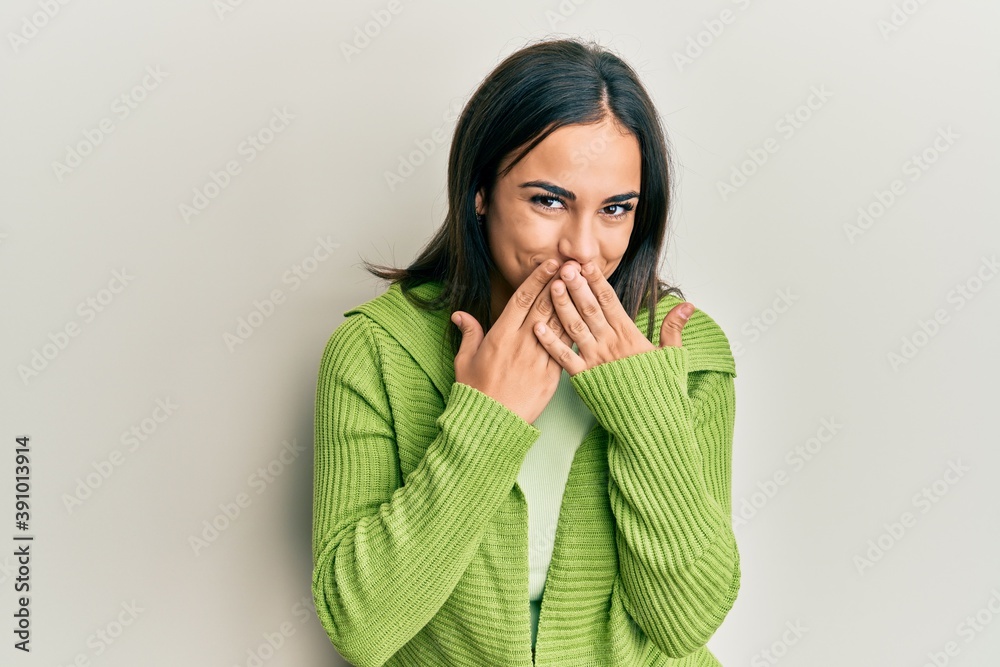Young brunette woman wearing casual clothes laughing and embarrassed giggle covering mouth with hands, gossip and scandal concept