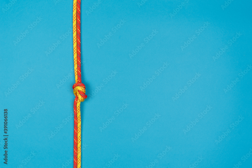 Overhand knot with red and yellow climbing rope on blue background