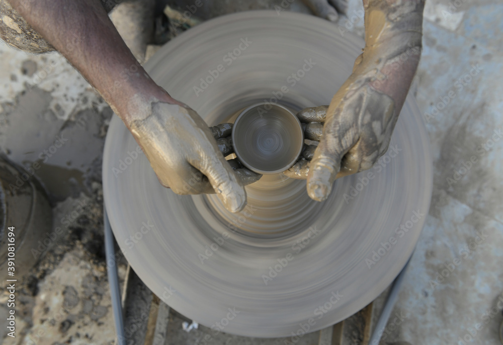 A potter makes diyas or clay lamps or earthen lamps on potter's wheel ahead of Diwali festival in Beawar, Rajasthan, India. Photo: Sumit Saraswat