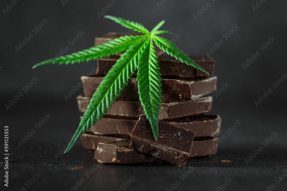 Cupcake with marijuana.traditional sponge cake with cannabis weed cbd. Medical marijuana drugs in food dessert, ganja legalization.Stack of chocolate slices with mint leaf on a wooden table.