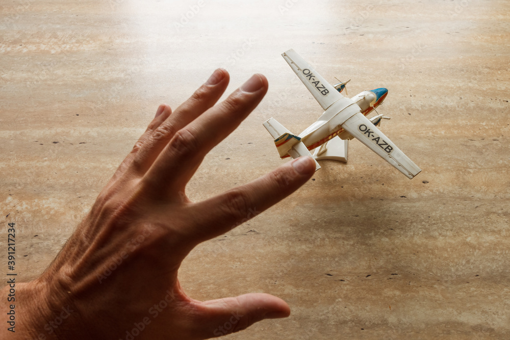 Scale model of a two-engined passenger plane and a male hand that wants to take it. Toy.