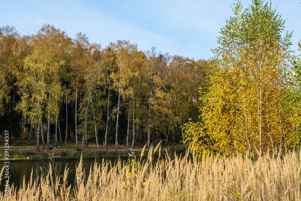Autumn landscape with yellow birch leaves and a quiet small river.