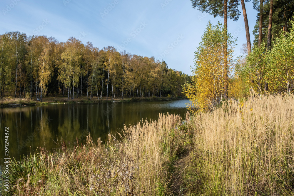 Autumn landscape with yellow birch leaves and a quiet small river.