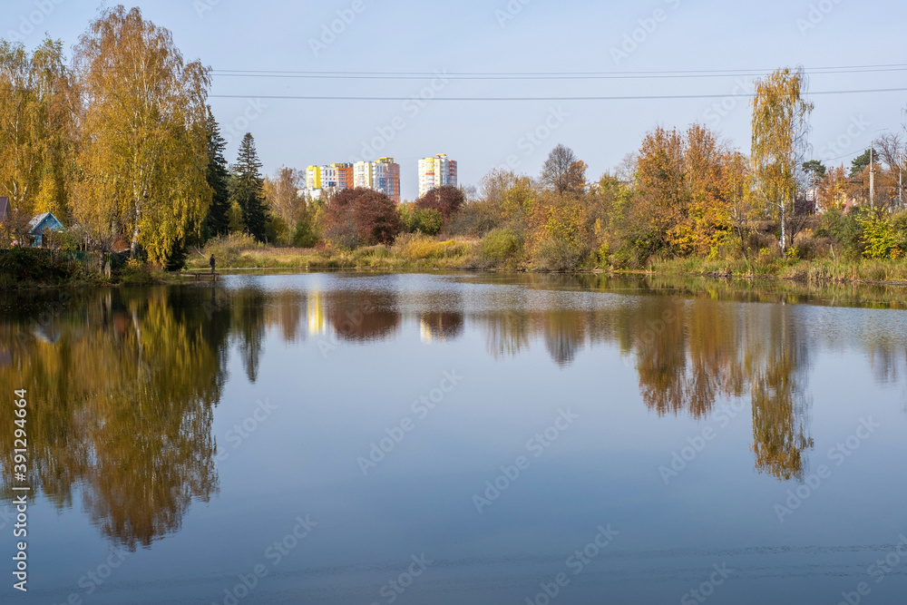 Autumn landscape with a small pond in the city of Kokhma, Ivanovo region.