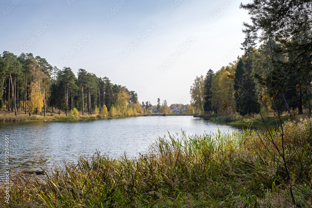Autumn landscape with a pond in the city of Kokhma, Ivanovo region.