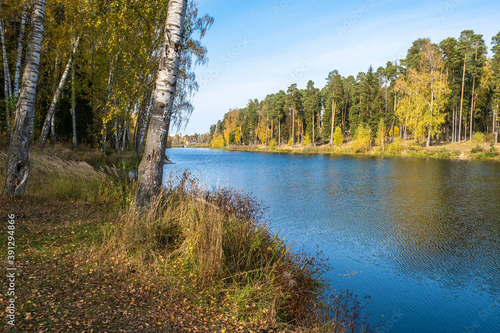 Autumn landscape with a pond in the city of Kokhma, Ivanovo region.
