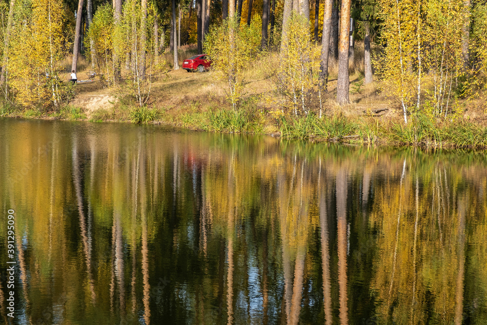 River Bank with tall pine trees reflected in the water on an autumn day.