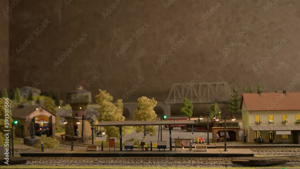 Retro toy railway station. Side view miniature model of a railway station.