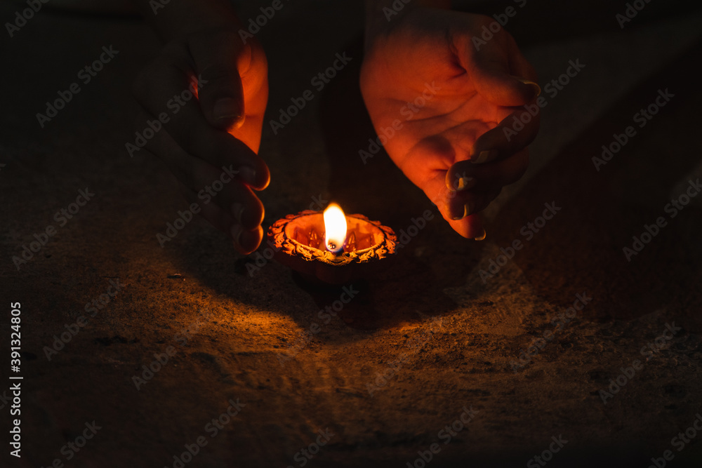 Close up shot of illuminating diya with woman hands protecting it from wind