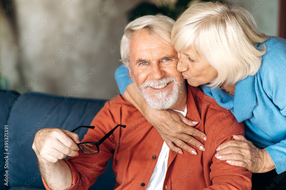 Happy elderly gray-haired couple hugging and sits on the sofa at home, wife kisses husband and husband looks at the camera and smiles