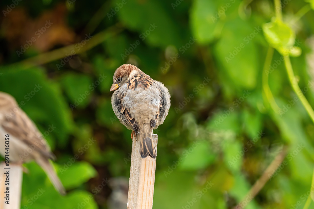 one cute chubby sparrow resting on a wooden stick in the garden with green leaves covered wall in the background