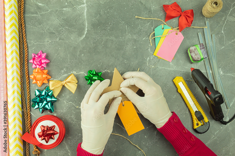 Women's hands in protective gloves are packing gifts for the holidays.