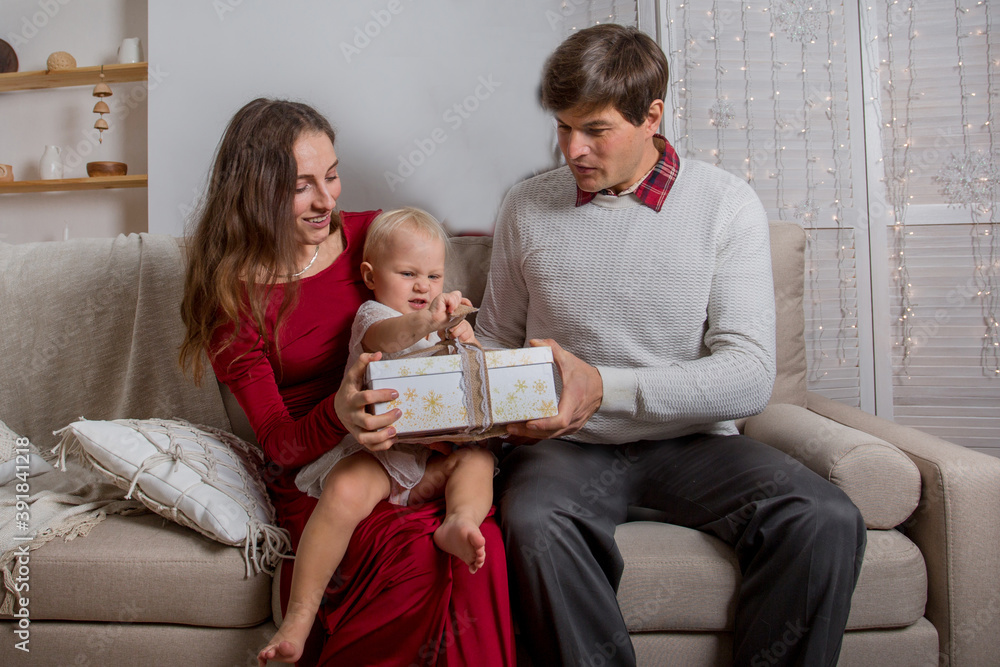 family sitting on the sofa with gifts. Father, mother and baby girl