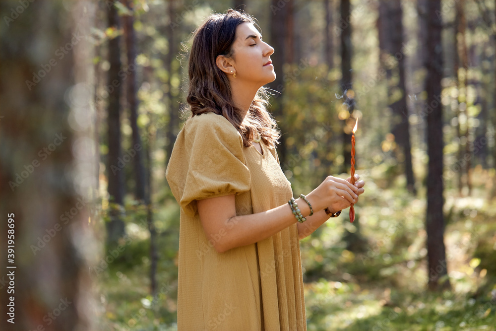occult science and supernatural concept - young woman or witch with candle performing magic ritual in forest