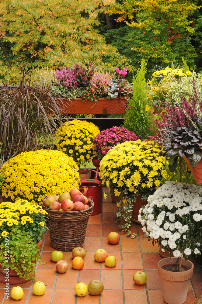 Balkon mit Herbstblumen.