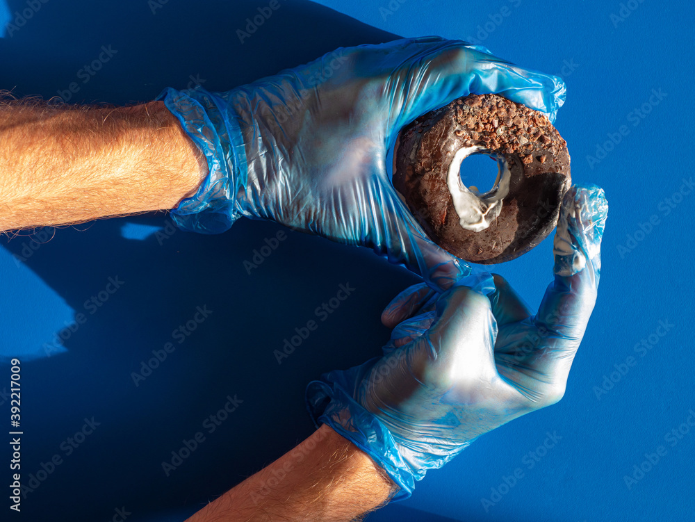 Male hand holding donut with cream. Doctor urologist in medical gloves doing prostate massage. Urology men's sex health concept. Prostatitis disease dysfunction problem. Gynecology sexology proctology