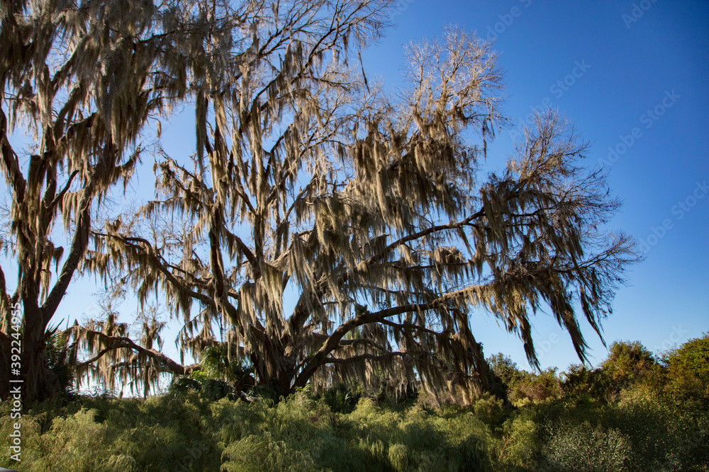 A Live Oak tree branches covered in Spanish Moss above a wetlands park in Florida