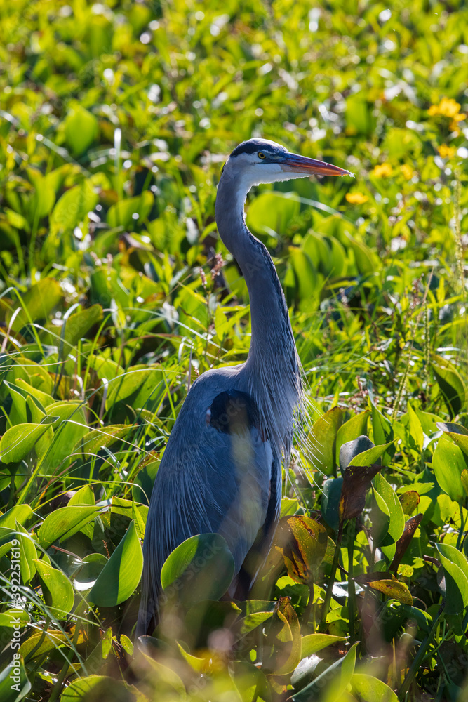 A single majestic Great Blue Heron forages for insects and crustaceans in a Florida wetland park