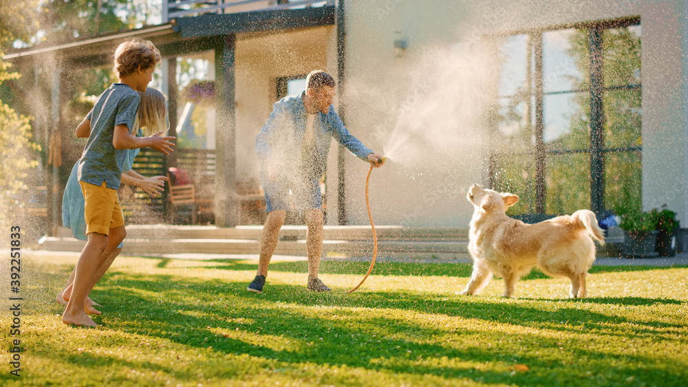 Father, Daughter, Son Play With Loyal Golden Retriever, Dog Tries to Catch Water from Garden Water Hose. Family Spending Fun Outdoors Time Together. Sunny Day Idyllic Suburban Home.