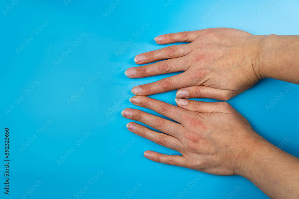 Female hands with nails affected by fungus on a blue background. Hand health and hygiene.