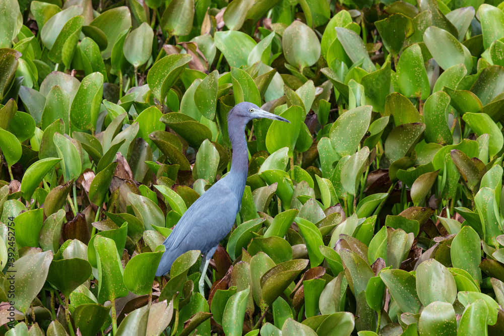 A solitary Little Blue Heron forages for lizards in a wetlands park in Florida