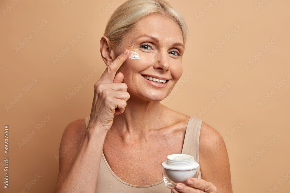 Smiling tender woman holds jar of cream with anti aging effect applies on face has healthy glowing skin looks pleasantly at camera undergoes beauty treatments isolated over brown background.