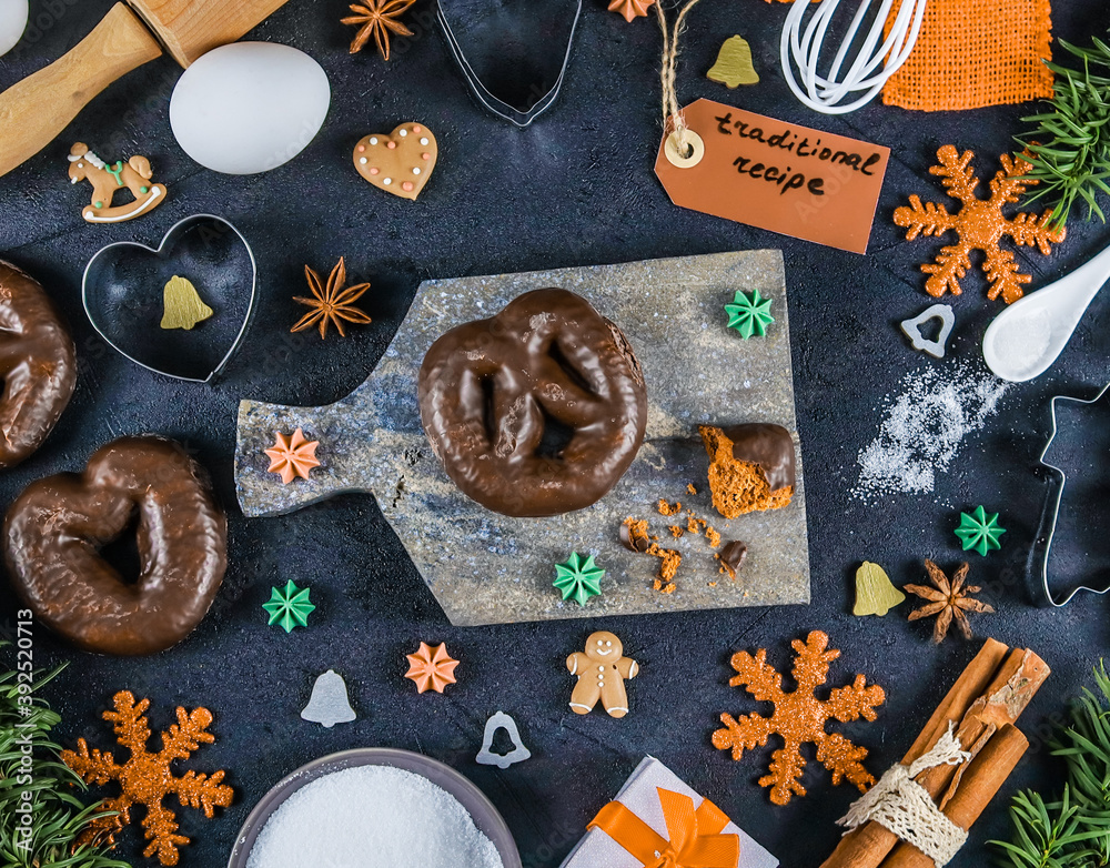 gingerbread and ingredients. Gingerbread on a blackboard and ingredients around on a black background, close-up top view.